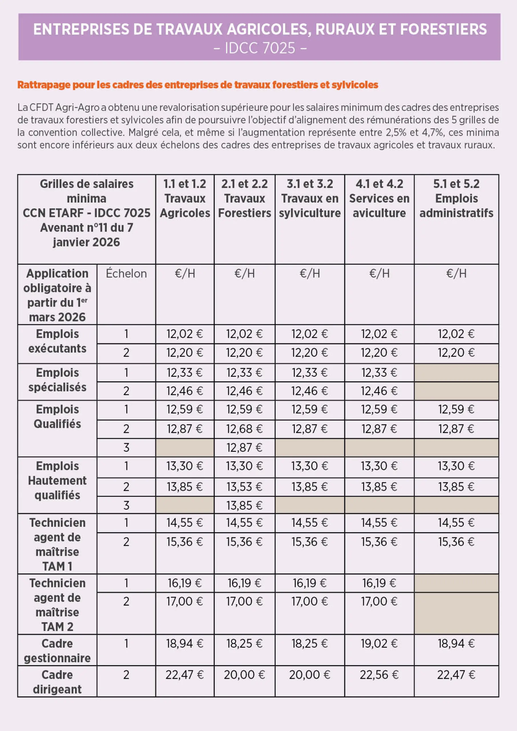 La CFDT Agri-Agro a obtenu une revalorisation supérieure pour les salaires minimum des cadres des entreprises de travaux forestiers et sylvicoles afin de poursuivre l’objectif d’alignement des rémunérations des 5 grilles de la convention collective. Malgré cela, et même si l’augmentation représente entre 2,5% et 4,7%, ces minima sont encore inférieurs aux deux échelons des cadres des entreprises de travaux agricoles et travaux ruraux.